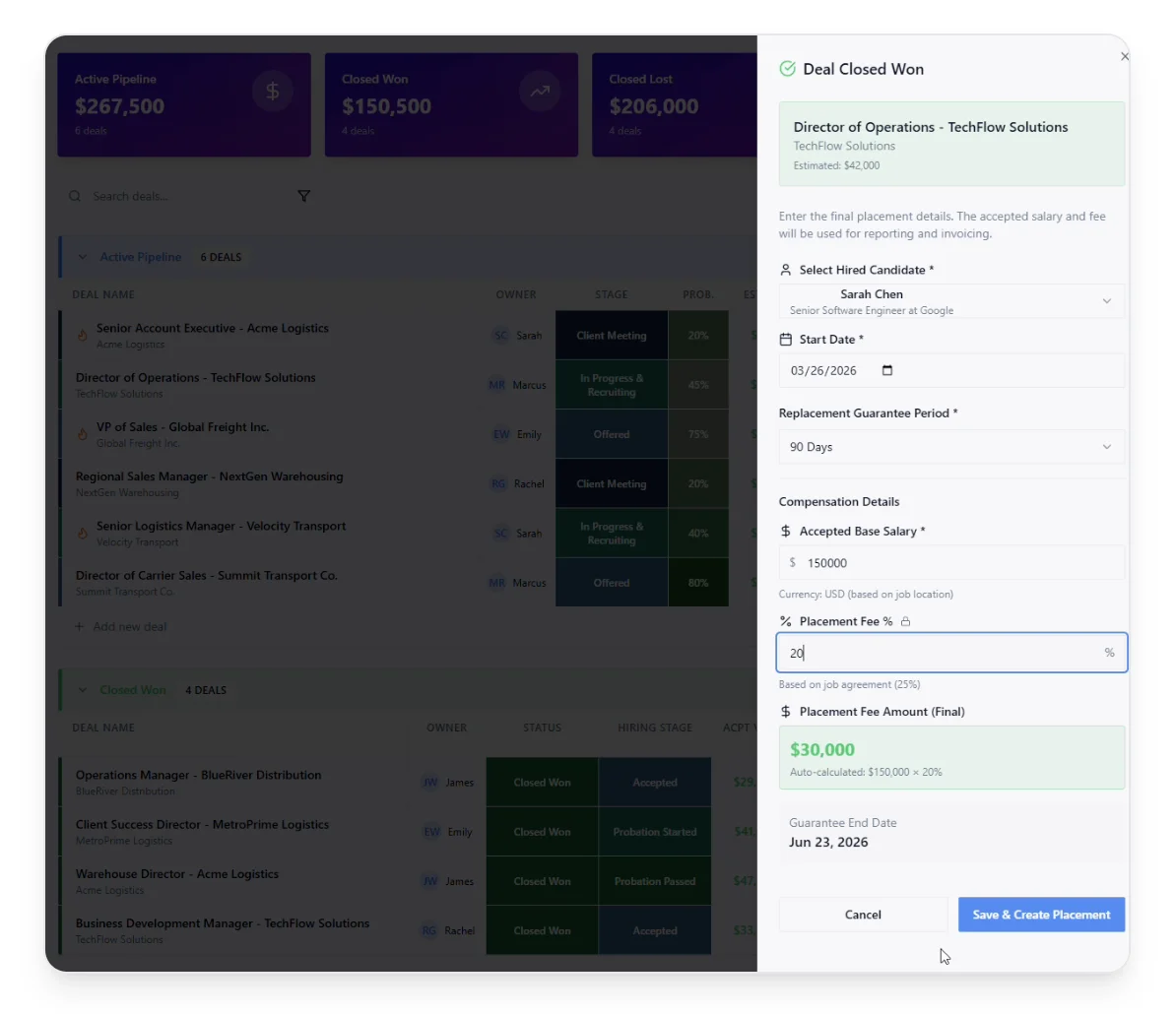 Most CRMs were built for sales teams, not recruitment agencies. Recruitable gives you a full Candidate CRM and a full Client CRM in one platform and they talk to each other. Every placement automatically tracks commissions, starts the guarantee clock, and moves candidates through each stage. Every client has a full profile with active jobs, submitted candidates, invoices, and communication history all in one place.