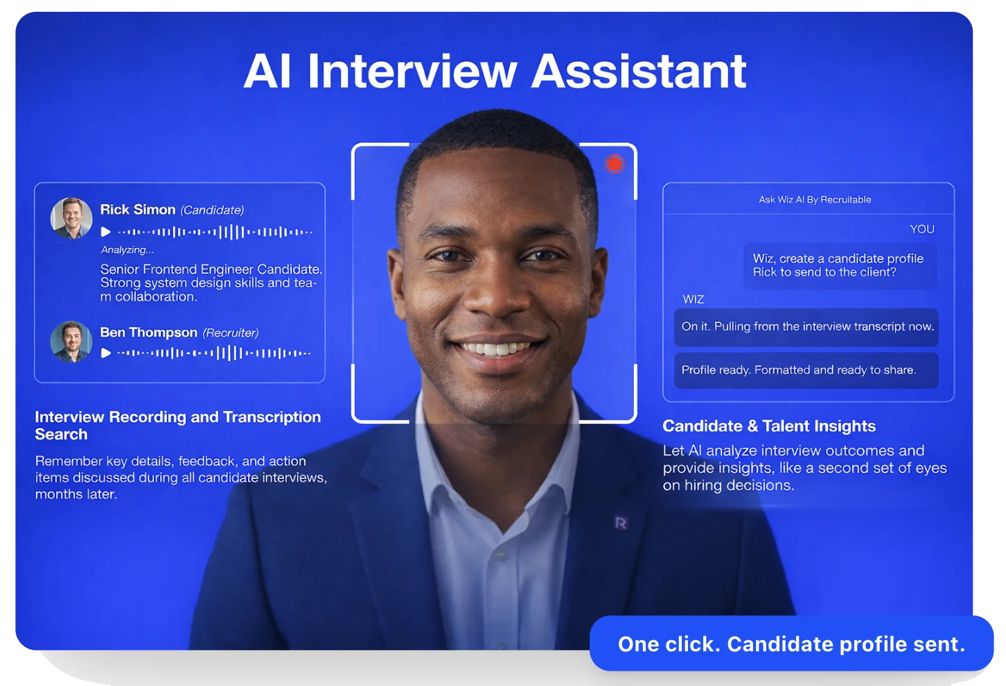 After every candidate interview, Recruitable records and transcribes the call. Recruiters click one button, Wiz AI reads the transcript and resume, generates a polished candidate profile tailored to the client and role, and sends it directly. What used to take 45 minutes now takes one click.